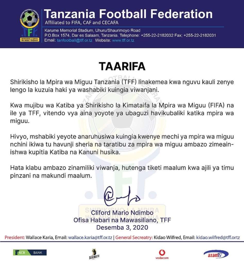 Shirikisho la soka nchini Tanzania }{TFF}, imekemea vikali kauli zenye lengo la kuzuia haki ya mashabiki kuingia viwanjani kwa lengo kushuhudia michezo mbalimbali kwani kila Mshabiki anaruhusiwa kuingia kwenye Mechi yoyote ikiwa tu havunji sheria taratibu za mpira zilizowekwa
