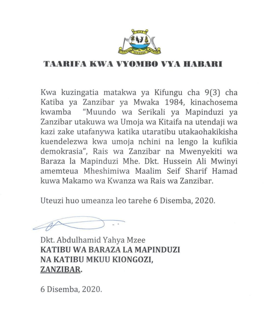 Rais wa Zanzibar na Mwenyekiti wa Baraza la Mapinduzi Dkt.Hussein Ali Mwinyi amemteua Maalim Seif Shariff Hamad, kuwa Makamu wa Kwanza wa Rais wa Zanzibar kuanzia leo December 06, 2020