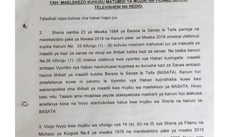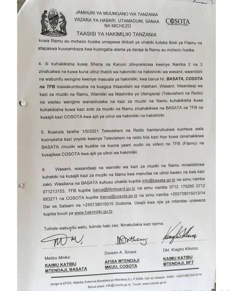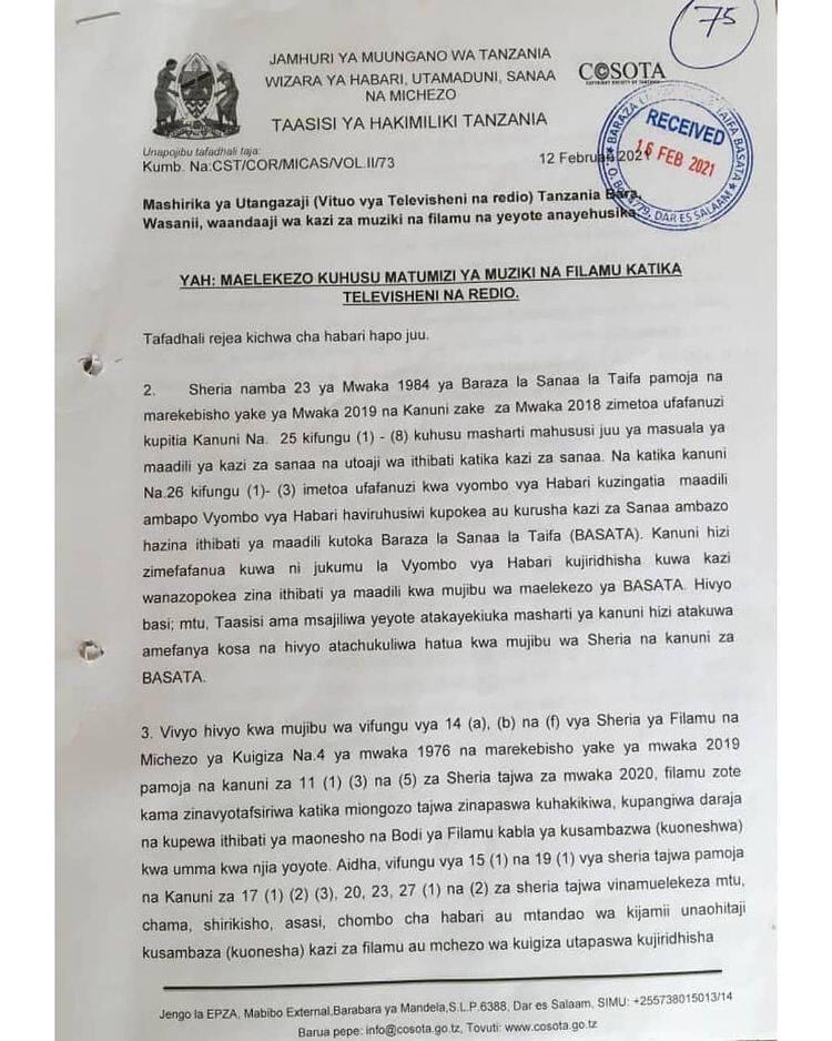 Taasisi ya Hakimiliki Tanzania (COSOTA) imevitangazia Vituo vyote vya Redio na Televisheni kuacha kucheza kazi za Muziki na Filamu ambazo hazitakuwa zimehakikiwa